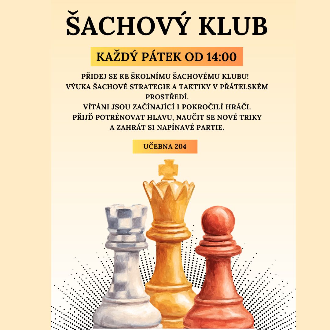Zveme všechny studenty, aby se přidali ke školnímu šachovému klubu. V přátelském prostředí se zde můžete věnovat výuce šachové strategie a taktiky. Klub je otevřený pro začátečníky i pokročilé hráče.
