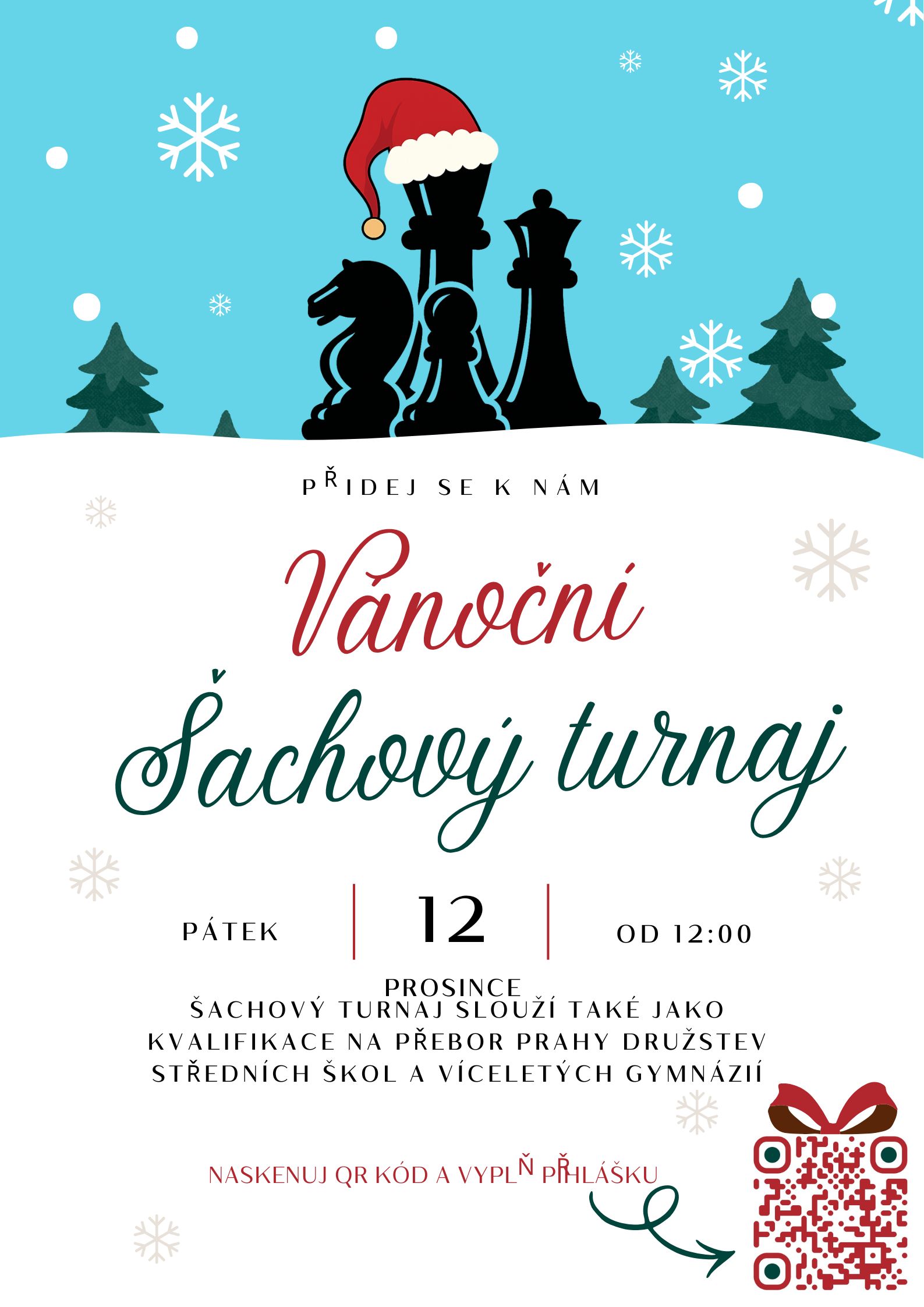 Pokud se chcete zúčastnit, naskenujte QR kód z plakátu a vyplňte přihlášku. Přijďte si užít příjemnou předvánoční atmosféru a změřit své šachové dovednosti!